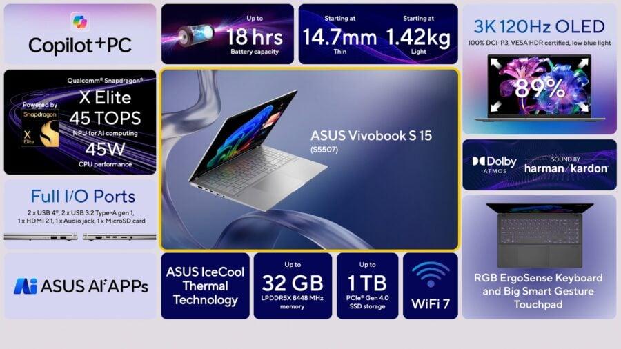 During the Next Level online presentation . AI Incredible ASUS announced a new generation of computer s with artificial intelligence. He became its first representative laptop ASUS Vivobook S 15 (S5507), which is part-time the Copilot + computer . Its price starts at $1299.